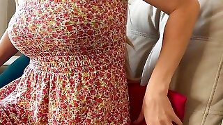 Neighbour distract MILF from work, so she helps cum with hand job in share couch, but get plow