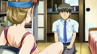 Steaming hentai babe in purple lingeria smoking and teasing a boy with her assets