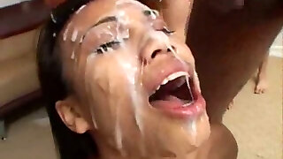 Stroking guys step up and glaze her face in mass ejaculation cumshots