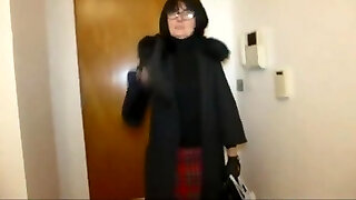 Mature, French brunette with glasses is wearing black stockings while making her first porn video