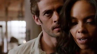 Two delicious dark skin dark-haired honies in black dress share a brutal guy for threesome