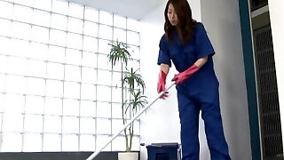 When this maid concludes cleaning she uses her pussy to clean his cock