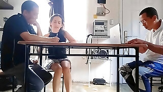 Unfaithful wifey sucks the collector's cock and drinks the cum behind the hotwife's back under the table.